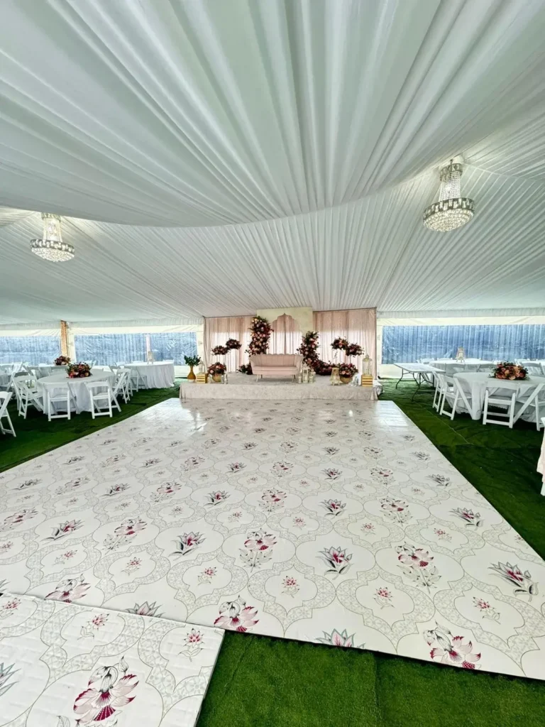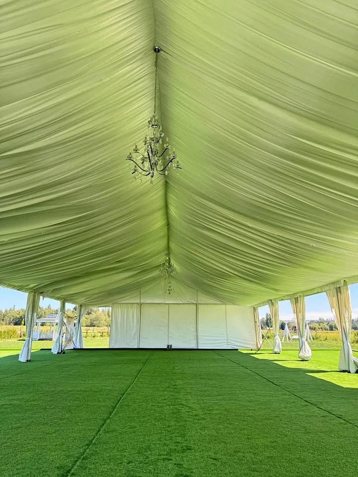 Tent size depends on your guest count, layout (seated, standing, buffet), and any extras (stage, dance floor, etc.). We’ll help you calculate the perfect fit.
